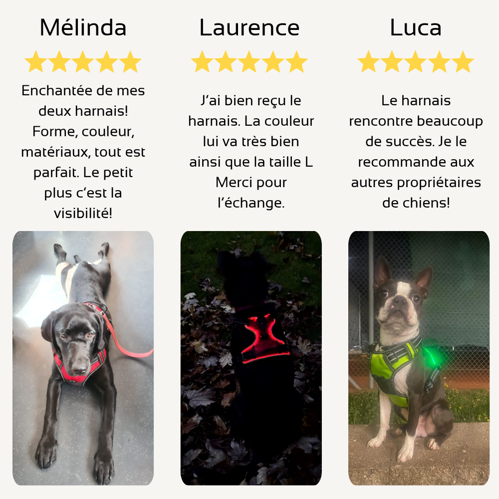 90% de nos clients disent se sentir plus serein lors de leurs balades nocturnes grâce à notre harnais lumineux. Ils regrettent de ne pas l'avoir acheté plus tôt!