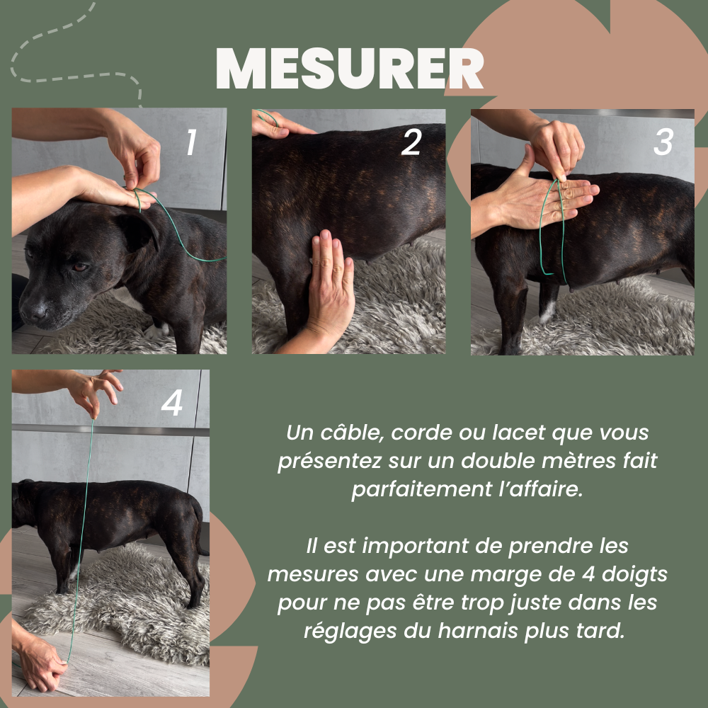 - Mesurez le cou et le buste de votre chien 5cm en arrière des coudes en laissant 4 doigts entre votre chien et le ruban lors de la prise de mesure