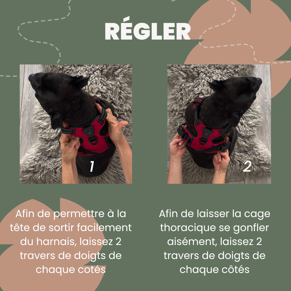 - Le réglage est important. La tête de votre chien doit pouvoir sortir aisément lors du retrait du harnais.