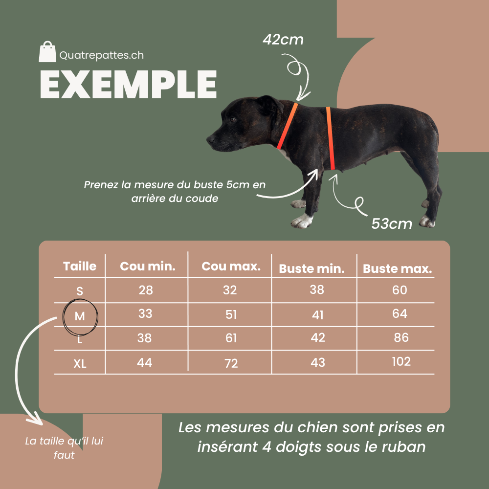 - Si votre chien se trouve entre deux tailles ou proche de la fin d'une taille, optez pour la taille supérieure.